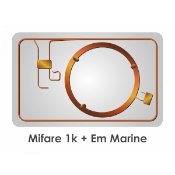 RFID чип карты EM Marine работает на частоте 125 кГц, RFID чип карты Mifare Plus SE 1k 7b работает на частоте 13,56 МГц. Поэтому этих два чипа можно объединить в одной карте, и они не будут создавать помех для работы друг друга.