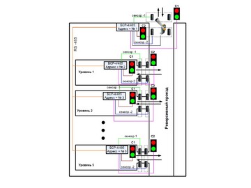 Организации регулирования движения c помощью двухсекционных светофоров на многоуровневых паркингах с одним общим (реверсивным) проездом.